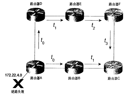 路由器C在t1时刻,收到来自路由器B传递的LSA,路由器C将相关信息输入到链路状态数据库(LSDB),并向路由器F转发。在t3时刻,另一份相同的LSA拷贝经过A-D-E-F-C到达路由器C。路由器C发现LSDB中已经存在该LSA,那么路由器C会不会将该LSA继续转发给路由器B呢?答案是不转发,因为路由器C是从邻居路由器B收到这个通告的。