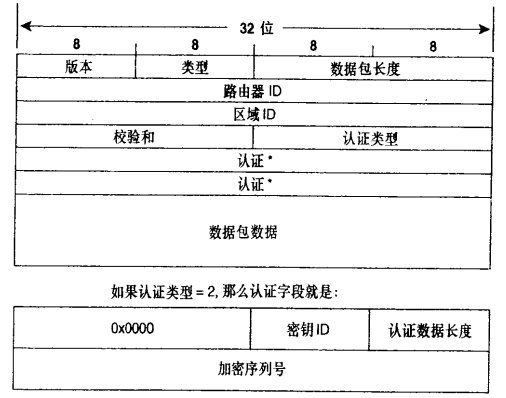 | 8 | 认证(Authentication) | 如果AuType=0,不检查该字段,如果AuType=1,将包含一个密钥,如果AuType=2,这个认证字段将包含KEY ID、认证数据长度、加密序列号、认证密钥。 |