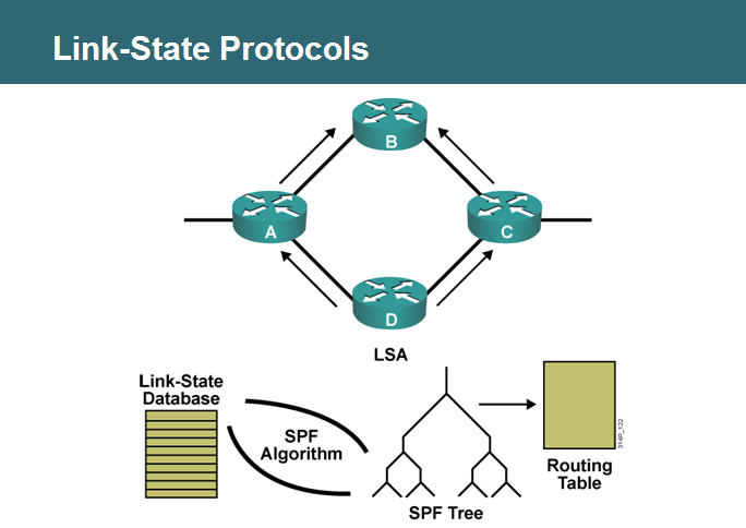 OSPF是一种链路状态路由协议。不同于距离矢量路由协议依照传闻进行路由选择的工作方式,链路状态路由器从其他路由器那里获取第一手信息。每台路由器会产生一些关于自己、本地直连链路、这些链路的状态和所有直连邻居的信息(LSA)。这些信息从一台路由器传送到另一台路由器,每台路由器都在一份信息拷贝,但绝不改动信息。最终目的是每台路由器都有一个相同的相关网络的信息,并且每台路由器以自己为根独立的计算各自的最优路径。