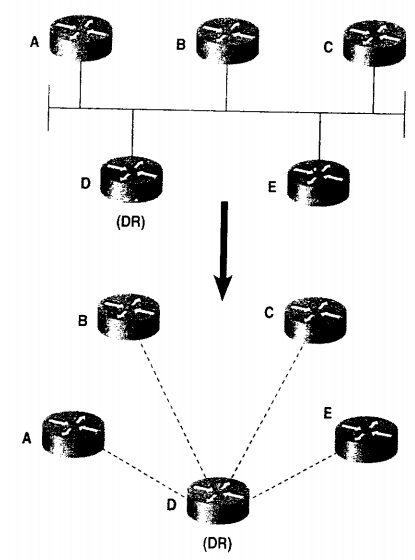 DR描述一个多路访问网络,网络上的其他路由器都将和这个指定路由器形成邻接关系,而不是所有路由器都相互形成邻接关系。